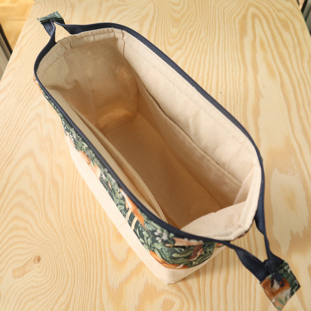 This a single project made with 100% cotton upper exterior in the pattern of your choice and cream 100% cotton muslin interior and bottom, lightly interfaced. There is a wire frame just underneath the zipper which helps it stay open when open, and helps turn the corners down when closed. There are two interior pockets.